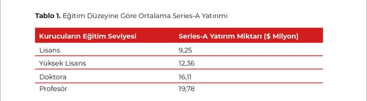 Aşağıdaki tablo, kurucuların akademik yetkinlik seviyesi ile Series-A aşamasında toplanan yatırım miktarı arasındaki pozitif korelasyonu göstermektedir: