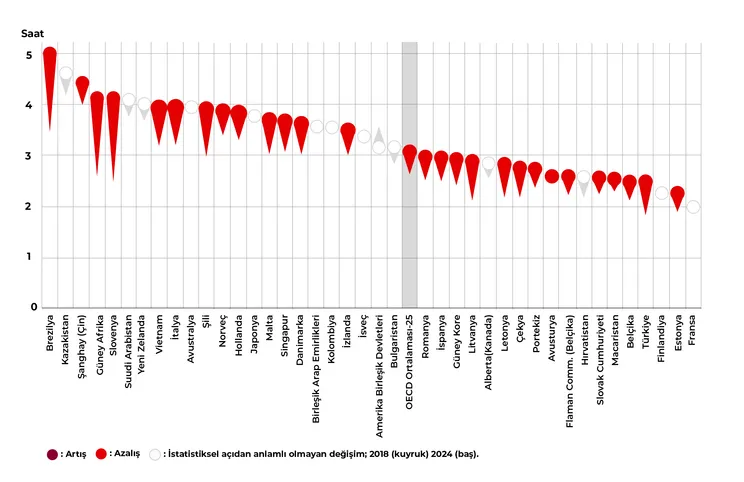 Öğretmenlik mesleğinde iyi bir iş-yaşam dengesine sahip olmak, stresin olumsuz etkilerini azaltma konusunda destekleyici olabilmektedir. Öğretmenlik, yalnızca okul saatleriyle sınırlı olmayan, ders hazırlığı, öğrenci takibi, veli ve okul yönetimiyle sürekli iletişim, değerlendirme ve geri bildirim süreçlerini de içeren çok boyutlu bir meslektir. Bu durum, öğretmenlerin iş yükünü görünür mesai saatlerinin ötesine taşımakta ve zaman yönetimi ile duygusal dengeyi korumayı zorlaştırabilmektedir. Verilere bakıldığında Türkiye’de öğretmenlerin 2018’den 2024’e doğru stres düzeylerinde artış olduğu görülebilir. Ancak bu düzey OECD ortalamasının altında kalmaktadır. Türkiye’de öğretmenlerin stres düzeylerinin OECD ortalamasından düşük olması çalışma performansına olumlu yansıması koşulu ile bir fırsat olarak değerlendirilebilir. Öğretmenlerin iş-yaşam dengesi üzerinde yapılan düzenlemeler; düşük stres seviyeleri, mesleki sürdürülebilirlik ve eğitim kalitesi açısından iyileşmeler sunacaktır. Bu veriler bağlamında öğretmenlerin iş yükünü daha yönetilebilir kılacak, mesleki tatmini artıracak ve dolayısıyla öğrencilerin öğrenme süreçlerine olumlu katkı sağlayacak stratejiler önceliklendirilmelidir.