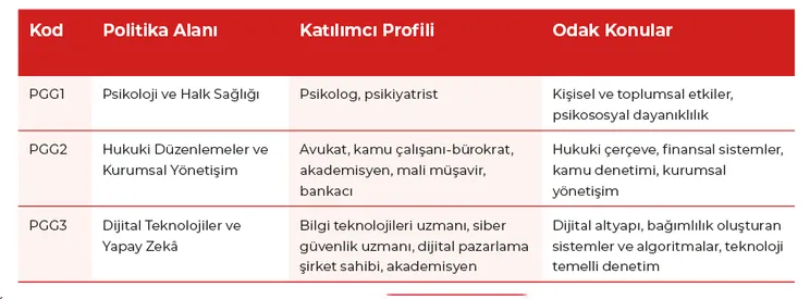 Disiplinler Arası Doğrulama: Elde edilen ham bulgular, psikoloji, hukuk, sosyoloji, kamu yönetişimi ve yapay zekâ alanlarından uzmanların yer aldığı Politika Geliştirme Grupları (PGG) tarafından bir “uygulanabilirlik süzgecinden” geçirilmiştir. Bu süreç, akademik bulguların sahadaki gerçeklikle ve mevzuat diliyle uyumlanmasını sağlamıştır.