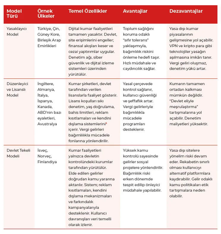 Dolayısıyla hiçbir model tek başına yeterli bir çözüm sunmamaktadır. Her ülkenin hukuki düzeni, dijital denetim kapasitesi ve toplumsal hassasiyetleri doğrultusunda farklı risk ve fırsatlar ortaya çıkmaktadır. Dijital kumarla mücadelede etkili politikalar, yasak, denetim ve önleme araçlarının dengeli biçimde harmanlandığı karma modellerin geliştirilmesine bağlıdır.