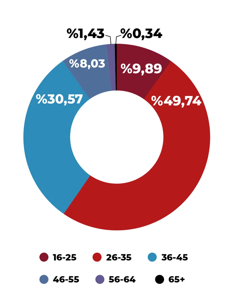 YEDAM’a tedavi için başvuru yapanların yaş ortalaması 34,7 düzeyinde seyretmektedir. Bu ortalama, dijital kumarın belirli bir yaş grubuna has olmaktan ziyade, hem genç yetişkinleri hem de orta yaş grubunu kapsayan geniş bir dağılım sergilediğini ortaya koymaktadır. Dolayısıyla yaş ortalaması, davranışın yaygınlığını açıklama noktasında tek başına sınırlı bir veri sunmakta; ancak diğer değişkenlerle birlikte değerlendirildiğinde anlam kazanmaktadır.