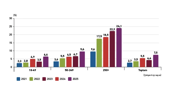 Yapay zekâ, farklı alanlarda değişen amaçlar ve ihtiyaçlar doğrultusunda çeşitlenen bir kullanım yapısına sahiptir. Girişimler ve kurumsal yapılar, yapay zekâyı üretim süreçlerini iyileştirmek, verimliliği artırmak ve veri temelli karar alma süreçlerini güçlendirmek için kullanmaktadır. Kişisel kullanım ise üretken yapay zekâ araçlarıyla metin, görsel, müzik veya yazılım kodu üretimi ile öğrenme süreçlerinin desteklenmesi şeklinde ortaya çıkmaktadır. Grafik 1, 2021-2025 yılları arasında Türkiye’deki girişimlerin büyüklüklerine göre yapay zekâ kullanım oranlarındaki değişimi göstermektedir. Veriler, yapay zekâ kullanımında belirgin bir artış eğilimine işaret etmektedir. 2021 yılında girişimlerin yalnızca %2,7’si yapay zekâdan yararlandığını bildirirken, 2025 yılı itibarıyla bu oran %7,5’e yükselmiştir. Bu bulgu, işletmelerin dijital teknolojilere ilgisinin güçlendiğini ve yapay zekânın iş süreçlerinde artık daha fazla yer aldığını ortaya koymaktadır.