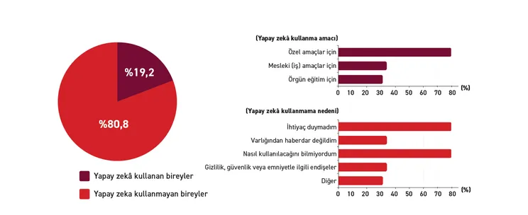 Bununla birlikte, kişilerin %80,8’i yapay zekâ kullanmadığını belirtmektedir. Bu yüksek oran, teknolojinin toplum genelinde henüz geniş bir kullanım alanına ulaşmadığını göstermektedir. Kullanıcı olmayanlar arasında en yaygın gerekçe %63,3 ile “ihtiyaç duymama”dır. Ayrıca %18,7’si yapay zekâyı nasıl kullanacağını bilmediğini, %12,4’ü ise bu araçların varlığından haberdar olmadığını ifade etmektedir. Bu bulgular, bilgi ve erişim eksikliklerinin yaygın kullanımın önünde bir engel oluşturduğunu ortaya koymaktadır. Öte yandan, %5,5 oranındaki gizlilik ve güvenlik kaygıları da teknolojinin toplumsal kabul sürecinde temkinli bir yaklaşımın sürdüğünü göstermektedir.