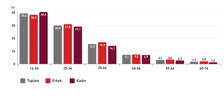 Yaş gruplarına göre yapay zekâ kullanım oranları değerlendirildiğinde, kullanımın özellikle genç yaş gruplarında belirgin biçimde yoğunlaştığı görülmektedir. 16-24 yaş grubunda toplam kullanım oranı %39,4 olup kadınlarda oran %40,5’e yükselirken erkeklerde %38,3 düzeyindedir. Benzer biçimde, 25-34 yaş grubu da %30 civarında bir kullanım oranına sahiptir. Buna karşın, yaş ilerledikçe kullanım oranlarında düzenli bir azalma ortaya çıkmaktadır; 45-54 yaş grubunda oran %7,1’e, 55-64 yaş grubunda %3,1’e ve 65-74 yaş grubunda %1,7’ye gerilemektedir. Bu tablo, yapay zekâ teknolojileriyle etkileşimin genç kuşaklarda daha yaygın olduğunu, yaş arttıkça kullanım eğiliminin belirgin şekilde zayıfladığını göstermektedir.