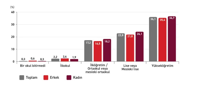 Grafik 6’da eğitim düzeyine göre yapay zekâ kullanım oranları gösterilmektedir. Bu doğrultuda yükseköğretim mezunlarında kullanım oranlarının açık biçimde diğer eğitim gruplarının üzerinde olduğu görülmektedir. Toplamda %36,1 olan kullanım oranı, erkeklerde %35,4 ve kadınlarda %36,7 düzeyindedir. Lise veya meslek lisesi mezunlarında kullanım oranı %22,8’e düşerken, ilköğretim veya ortaokul mezunlarında bu oran %17,2 seviyesindedir. İlkokul mezunlarında kullanımın yalnızca %2,2’ye gerilemesi, eğitim düzeyinin yapay zekâ kullanımında belirleyici bir faktör olduğunu göstermektedir. Bu dağılım, eğitim düzeyi yükseldikçe yapay zekâya erişimin arttığını ve bu teknolojilere daha fazla ihtiyaç duyulduğunu ortaya koymaktadır.