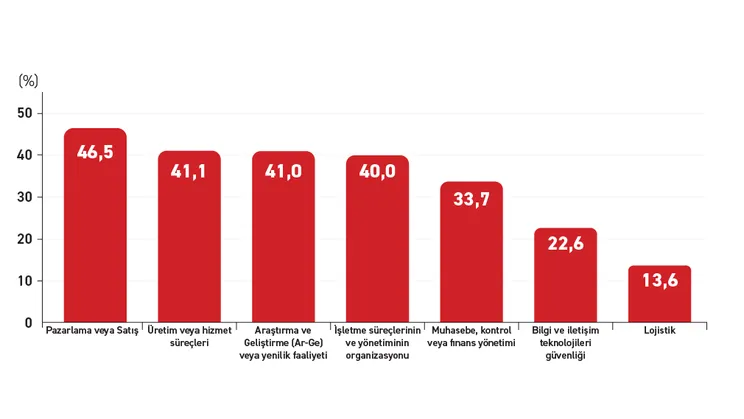 Grafik 4, yapay zekânın işletme süreçlerine hangi alanlarda entegre edildiğini göstermektedir. Verilere göre teknolojinin en yoğun kullanıldığı alan pazarlama ve satış faaliyetleridir (%46,5). Bu eğilim, yapay zekânın müşteri davranışlarını analiz etme, hedef kitle belirleme, kişiselleştirilmiş içerik üretme ve satış stratejilerini optimize etme gibi işlevlerde geniş bir kullanım alanı bulmasından kaynaklanmaktadır. Üretim ve hizmet süreçleri (%41,1), Ar-Ge ve yenilik faaliyetleri (%41,0) ile işletme süreçlerinin ve yönetiminin organizasyonu (%40,0) da yapay zekânın etkin biçimde kullanıldığı diğer alanlardır. Bu dağılım, işletmelerin üretim planlama, süreç optimizasyonu ve inovasyon gibi faaliyetlerde de yapay zekâdan giderek daha fazla yararlanmaya başladığını ortaya koymaktadır.