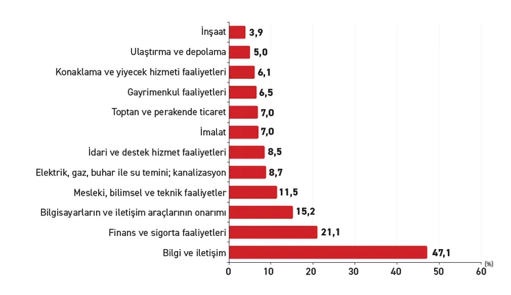 Bilgi ve iletişim alanında faaliyet gösteren girişimler, yapay zekâ kullanımında öne çıktı.